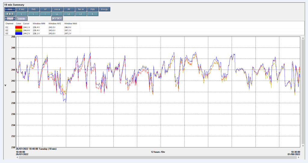 Interestingly, this “high” supply voltage is extremely common in the UK, and without getting into too much detail in this article, the utility could relatively easily reduce it. This could either be done at the local substation transformer by means of its incorporated tap changer, or at the higher transmission voltage level for a wider impact. Such action would both reduce the energy consumption (and bills) of their individual customers, and perhaps more importantly, reduce the total instantaneous energy demand on the grid. The latter being something that could help significantly in the current climate of impending potential energy shortages.