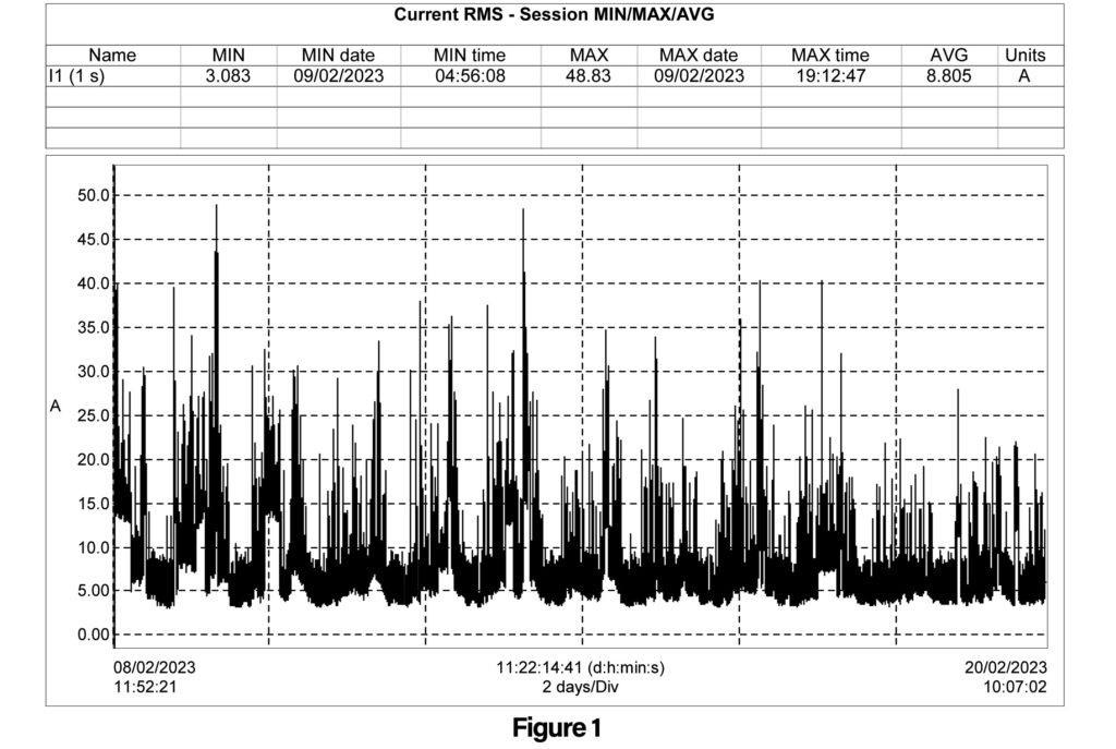 A graph of the total log (Figure 1) showed the maximum current drawn from the supply during the logging period was 48.83A which occurred at 19:12:47 on 9th February 2023. This event spanned a period of approximately 2 minutes. The average current drawn from the supply during the logging period was 8.85A.