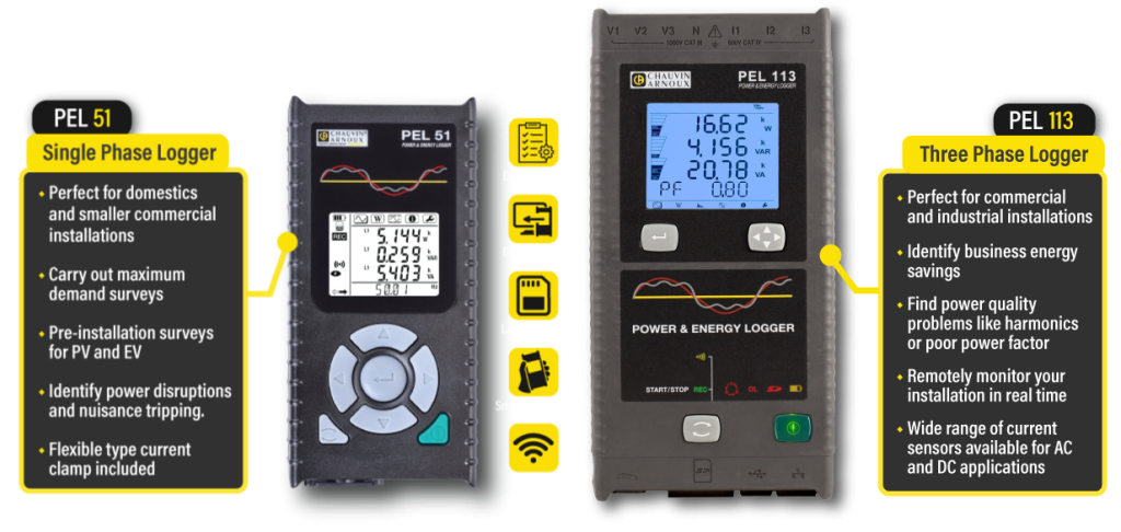 Whether you take on smaller residential projects or have set out on a mission to help businesses reduce their commercial energy consumption, our power and energy loggers are designed to suit your data logging needs. Here’s what Chauvin Arnoux single phase and three phase data loggers offer!