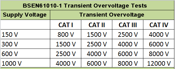 In the world of test equipment, products must be developed such that they are able to withstand specific transient voltages depending on the point on an electrical installation to which they will be connected and used according to BSEN61010-1 (see table).