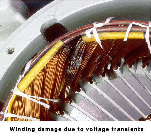 When a transient voltage occurs that is higher than the breakdown voltage of the insulation in a piece of equipment a flashover may occur. During the period of this flashover there is effectively a low impedance path created through the arc, which the lower normal supply voltage will now be able to flow through. With all of the energy of the mains supply behind it the burning effect of the arc will increase and can cause the immediate failure of insulation in rotating machines and other equipment.
