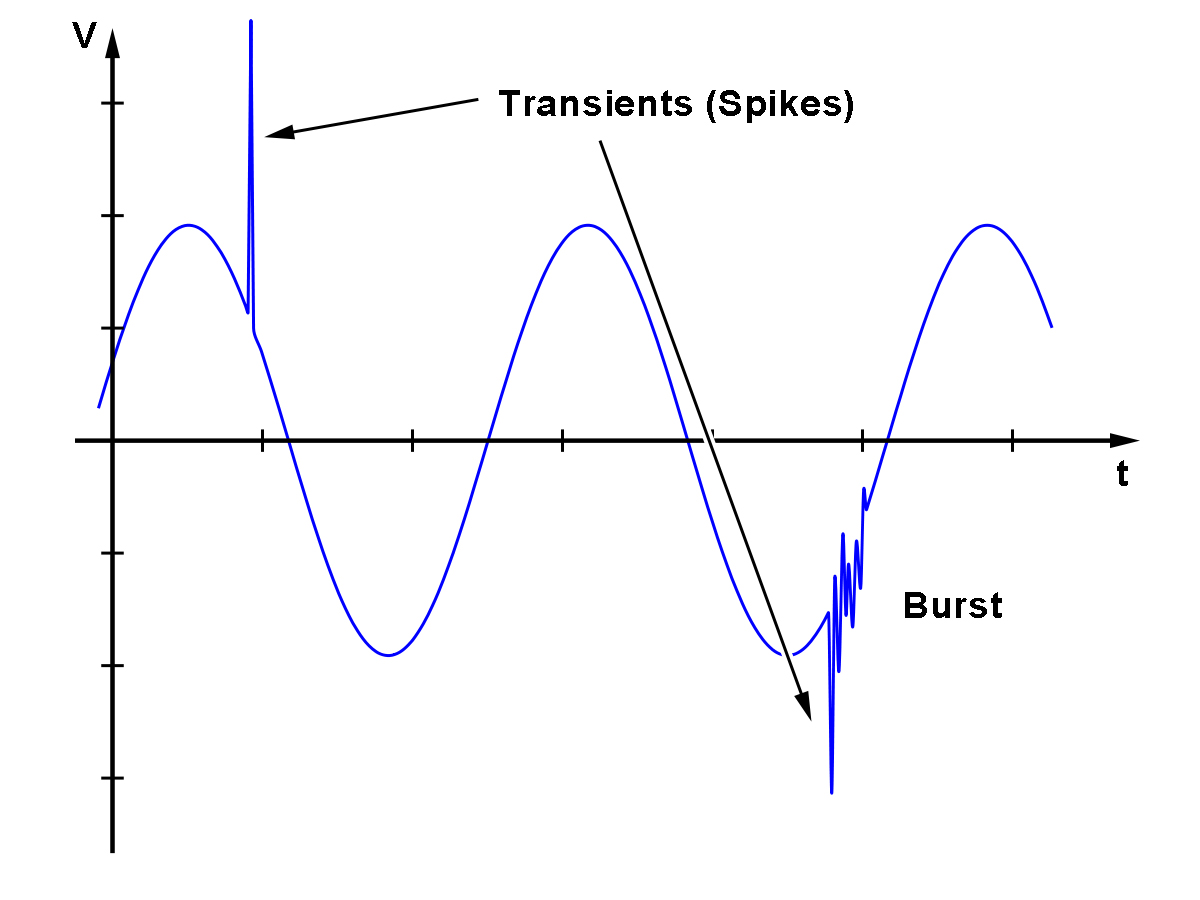 An electrical transient is a very fast, short duration spike in voltage which could be several kV in magnitude. This voltage spike produces a corresponding increase in current in the load, seen as a current spike, and this in turn results in a momentary increase in transferred energy. Depending on the magnitude and duration of the transient, the resulting transferred energy to the load can be of little to no consequence, or it could cause significant damage. Transients may also occur as bursts rather than singular events.