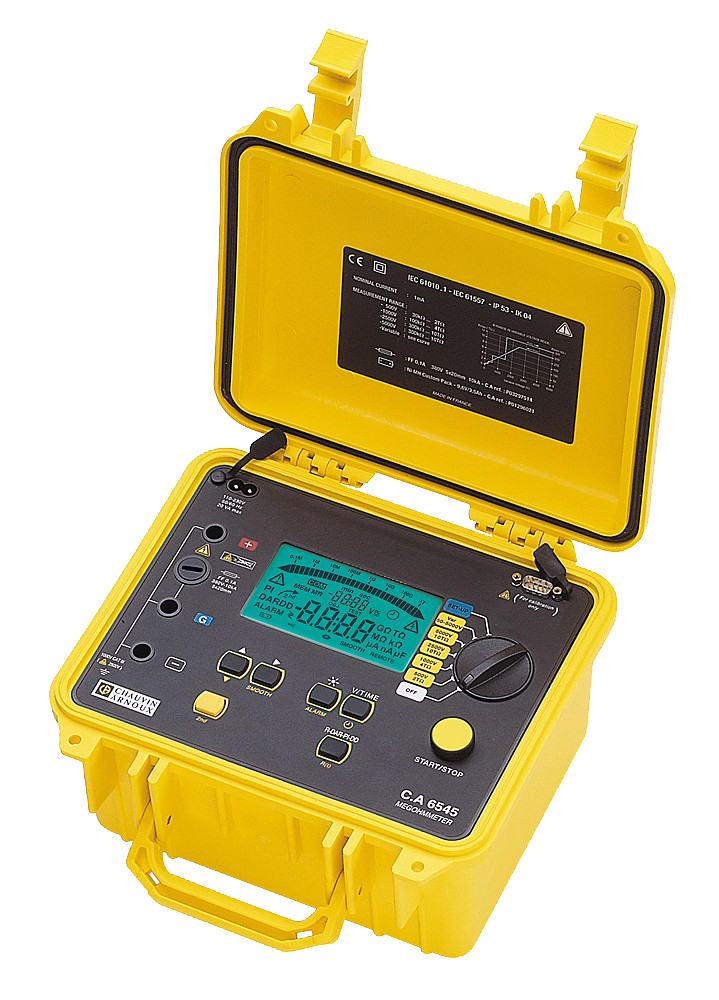 In its site-proof case, the C.A 6545 megohmmeter can be used for quantitative and qualitative analysis of insulation. It also automatically measures voltage, capacitance and residual current.
