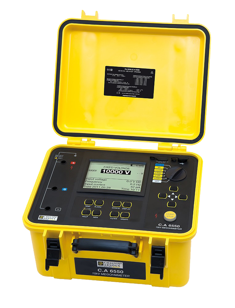 Specially adapted for checking insulation on rotating machinery with a 12 kV power supply or higher, the C.A 6550 complies with the IEEE43 standard which recommends insulation testing at 5-10 kV.