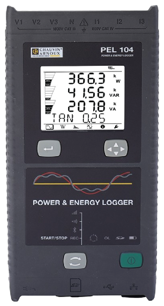 The Chauvin Arnoux PEL104 Power Energy Logger is an exceptionally well-built piece of kit designed to be suitable for all types of electrical networks. Automatically recognising the sensors connected, the PEL 104 includes 4 voltage inputs alongside 3 current inputs and crucially, can be operated without having to cut off the mains power supply. This power logger measures and records all the relevant data for energy consumption diagnostics, recording continuously with only a brief interval of 200ms between each measurement. Capable of 5 readings per second and recorded simultaneously on each phase, all data is captured as per the IEEE 1459 standard. Thanks to vast measurement ranges, voltage up 1,000 VAC/VDC and current up to 10 kVAC / 5 kVDC, the PEL 104 can log power values up to 10 GW/GVar/GVA, and energy up to 4 EWh/EVAh/EVarh. This makes the 104 ideal for energy usage analyses, load studies, energy surveys and complying with the energy audit requirements of ISO 50001 and EN 16247-3.